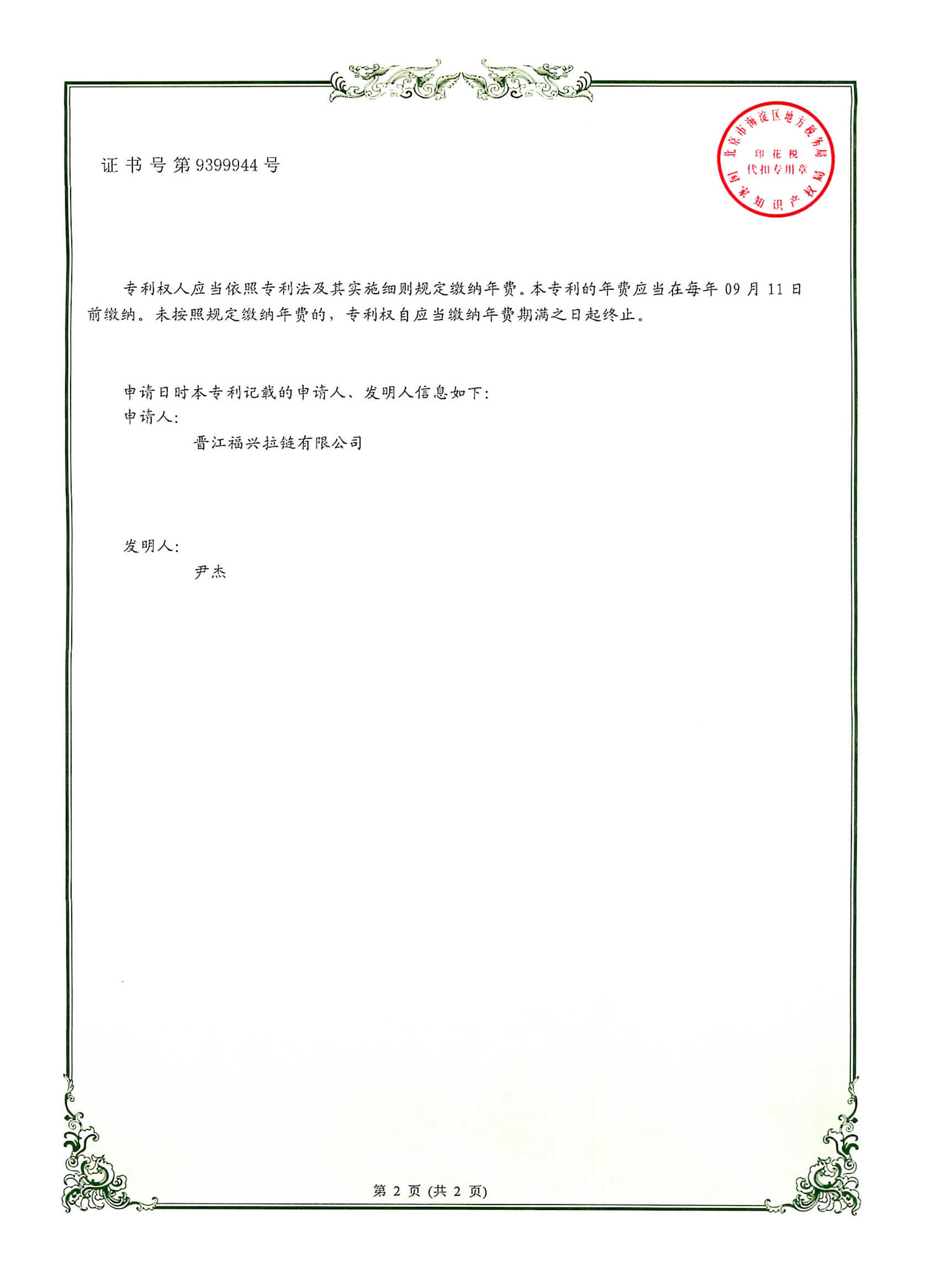 實用新型發(fā)明專利(第399944號)